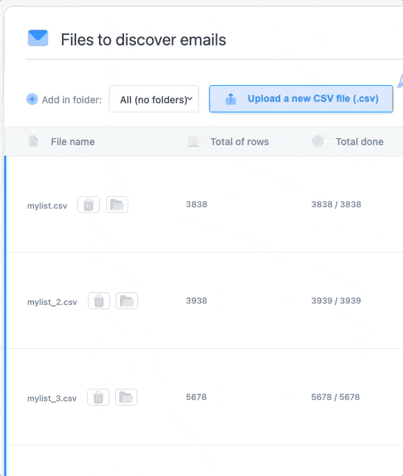 You will be able to upload a CSV with this information: first name, last name, and company name (or domain). Once you upload the data, the tool will try to find the email of each contact from the email format (for example, first.last@company.com). This tool is perfect for discovering emails from a list of business data.